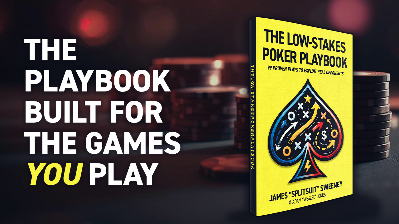The Low-Stakes Poker Playbook by James “SplitSuit” Sweeney and Adam “W34z3l” Jones takes a different approach. Instead of building a theoretical framework you have to translate at the table, the playbook gives you 99 ready-to-use plays built specifically for the players you face in real low-stakes games.